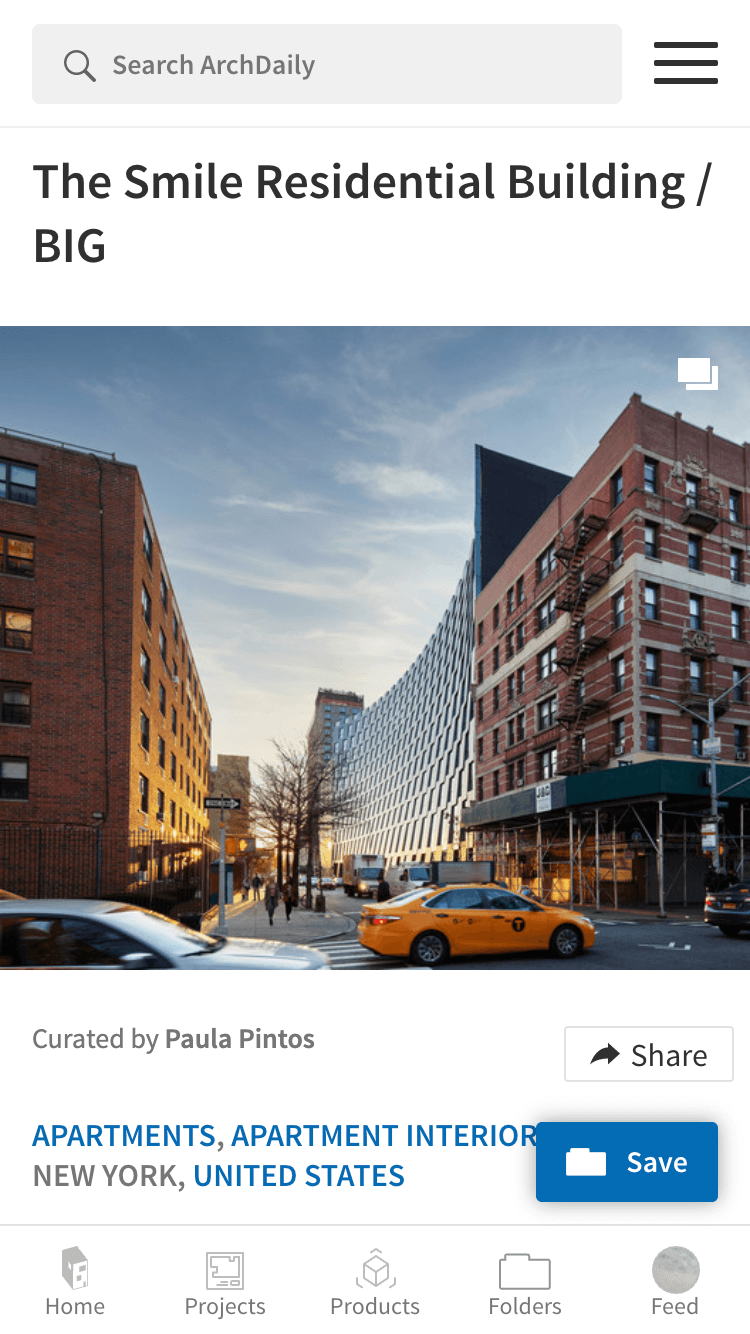 An important share of our traffic comes from mobile. In addition, our research showed that to access many pages in ArchDaily through mobile, it required more than 3 taps in average. We set out to simplify our navigation and showcase our new features (new search and information architecture). We added a bottom menu, a new hovering always viewable save button in singles, tabs for easier navigation in some areas such as MyAD, image grids to view saved items as a mood board of inspiration for architects.